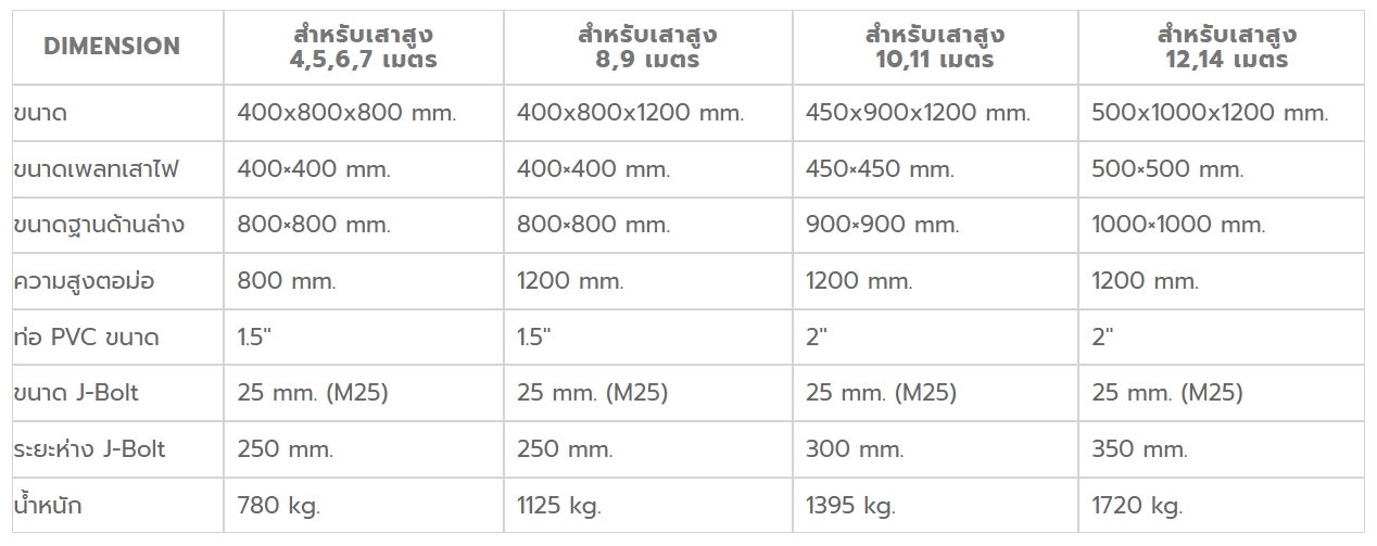 - สำหรับเสาไฟสูง 4 เมตร, 5 เมตร, 6 เมตร, 7 เมตร, 8 เมตร, 9 เมตร, 10 เมตร,